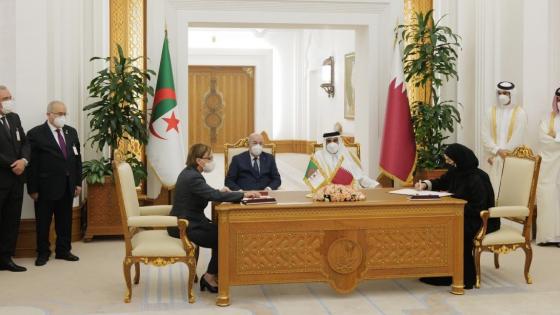 شهد حضرة صاحب السمو الشيخ تميم بن حمد آل ثاني أمير البلاد المفدى، وأخوه فخامة الرئيس عبدالمجيد تبون رئيس الجمهورية الجزائرية الديمقراطية الشعبية الشقيقة، التوقيع على اتفاقية ومذكرتي تفاهم وبرنامج تنفي