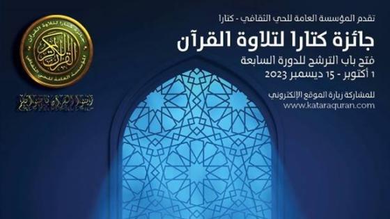 أعلنت المؤسسة العامة للحي الثقافي “كتارا”، عن فتح باب الترشح لـ”جائزة كتارا لتلاوة القرآن” في دورتها السابعة، خلال الفترة من 1 أكتوبر وحتى 15 ديسمبر المقبلين.