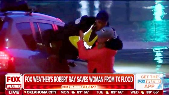 تدخل مراسل تلفزيوني أمريكي في الوقت المناسب، لإنقاذ سيدة من خطر الفيضان، بالتزامن مع إذاعته التطورات بفعل الطقس الاستثنائي في منطقة دالاس فورت وورث بولاية تكساس الأمريكية. وأنقذ روبرت راي، مراسل ال