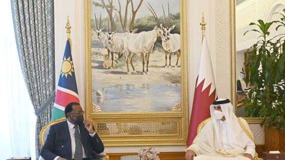 عقد حضرة صاحب السمو الشيخ تميم بن حمد آل ثاني أمير البلاد المفدى، مع فخامة الرئيس هاجي جينغوب رئيس جمهورية ناميبيا، جلسة مباحثات رسمية في الديوان الأميري صباح اليوم. وخلال الجلسة بحث الجانبان العلا