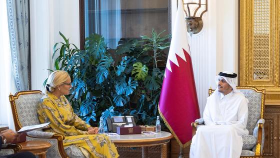 استقبل معالي الشيخ محمد بن عبدالرحمن بن جاسم آل ثاني، رئيس مجلس الوزراء وزير الخارجية، اليوم، سعادة السيدة سيغريد كاغ، وكيل الأمين العام وكبير منسقي الأمم المتحدة للشؤون الإنسانية وإعادة الإعمار في غزة، التي تزور البلاد حاليا.