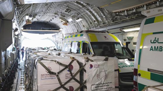 وصلت اليوم إلى مطار دمشق الدولي، طائرة تابعة للقوات المسلحة القطرية، تحمل على متنها مساعدات إنسانية تتضمن 31 طنا من المواد الغذائية وسيارات إسعاف.