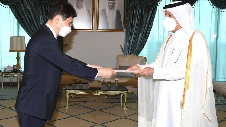 تسلم سعادة السيد سلطان بن سعد المريخي وزير الدولة للشؤون الخارجية، اليوم، نسخة من أوراق اعتماد سعادة السيد لي جون هو، سفير جمهورية كوريا لدى الدولة.