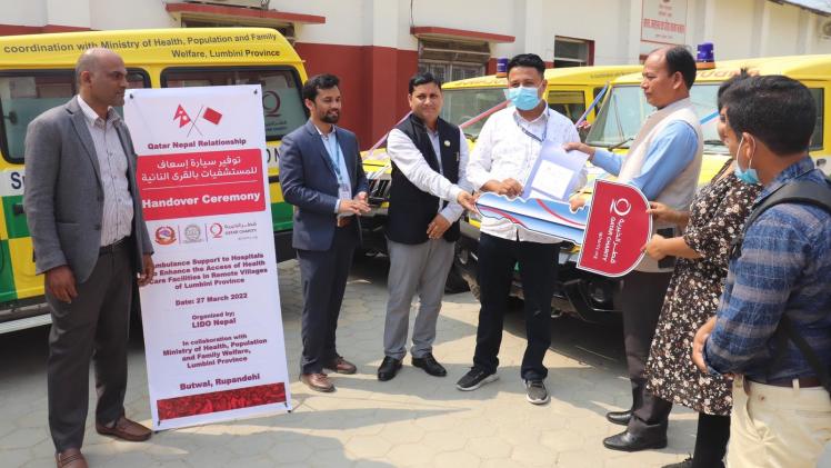 زوّدت قطر الخيرية عددا من المستشفيات ومراكز المناطق الريفية في نيبال بـ8 سيارات إسعاف مجهزة بكل مستلزماتها من الإسعافات الأولية، نظرا لحاجتها الماسة لها، وذلك بالتعاون مع وزارة الصحة والسكان ورعاية الأسرة بمقاطعة لومبيني.