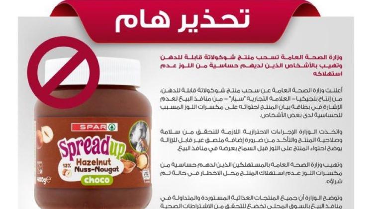 أعلنت وزارة الصحة العامة عن سحب منتج شوكولاتة قابلة للدهن، من إنتاج بلجيكيا- العلامة التجارية "سبار" - من منافذ البيع لعدم الإشارة في بطاقة بيان المنتج لاحتوائه على مكسرات اللوز المسبب للحساسية لدى بعض الأشخاص.
