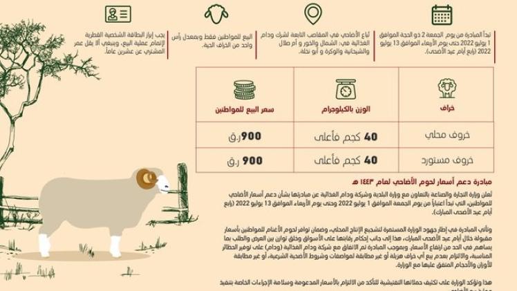 وأوضحت أنه تم الاتفاق مع شركة ودام الغذائية على توفير الخراف المحلية والمستوردة ليتم بيعها بأسعار مدعومة ومخفضة للمواطنين وفقاً للأوزان والأسعار المحددة، وهي: خروف محلي وزن 40 كيلوجراما فأعلى بسعر 900 ريال، وخروف مستورد بوزن 40 كيلوجراما فأعلى بسعر 900 ريال.