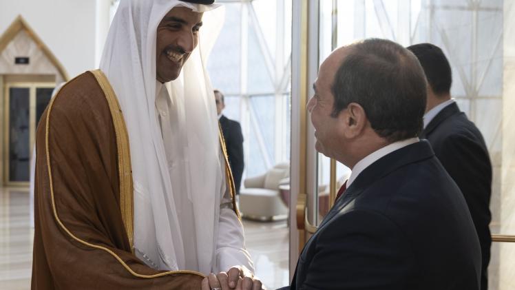تقدم حضرة صاحب السمو الشيخ تميم بن حمد آل ثاني أمير البلاد المفدى، مستقبلي أخيه فخامة الرئيس عبدالفتاح السيسي رئيس جمهورية مصر العربية الشقيقة، لدى وصوله والوفد المرافق الصالة الأميرية بمطار حمد الدولي، مساء اليوم، في زيارة رسمية للبلاد تستغرق يومين.
