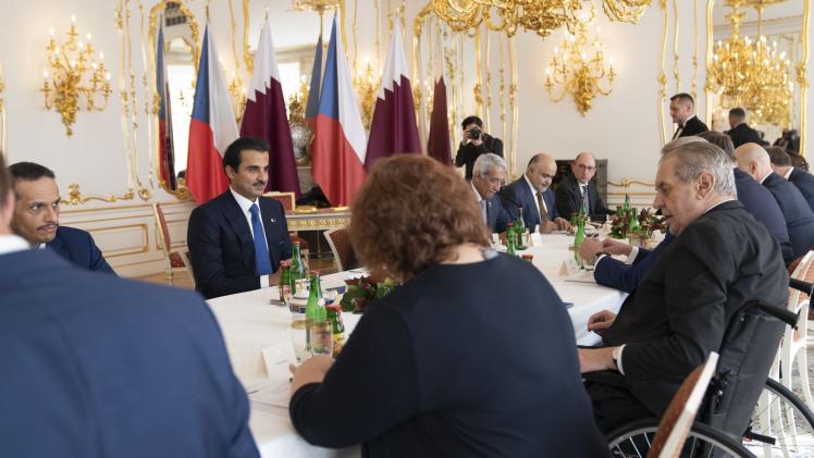 من جانبه، عبر سمو الأمير المفدى عن سعادته بوجوده في براغ في ضوء زيارة الدولة التي يجريها إلى جمهورية التشيك، معربا عن شكره لفخامة الرئيس التشيكي وحكومة بلاده وشعبها الصديق على حفاوة الاستقبال وكرم الضيافة، مشيرا سموه إلى متانة العلاقات القطرية - التشيكية وتطورها المستمر، وما يجمع البلدين من تعاون مشترك في مختلف القطاعات.