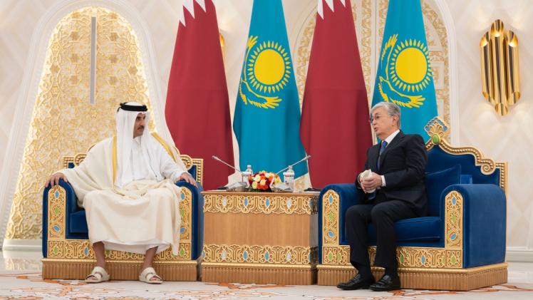 عقد حضرة صاحب السمو الشيخ تميم بن حمد آل ثاني أمير البلاد المفدى، جلسة مباحثات رسمية، مع فخامة الرئيس قاسم جومارت توكاييف رئيس جمهورية كازاخستان الصديقة، بالقصر الرئاسي "آق أوردا" في العاصمة أستانا، صباح اليوم.