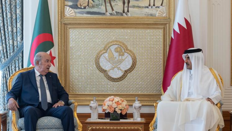 عقد حضرة صاحب السمو الشيخ تميم بن حمد آل ثاني أمير البلاد المفدى، وأخوه فخامة الرئيس عبدالمجيد تبون رئيس الجمهورية الجزائرية الديمقراطية الشعبية الشقيقة، جلسة مباحثات رسمية بالديوان الأميري اليوم.