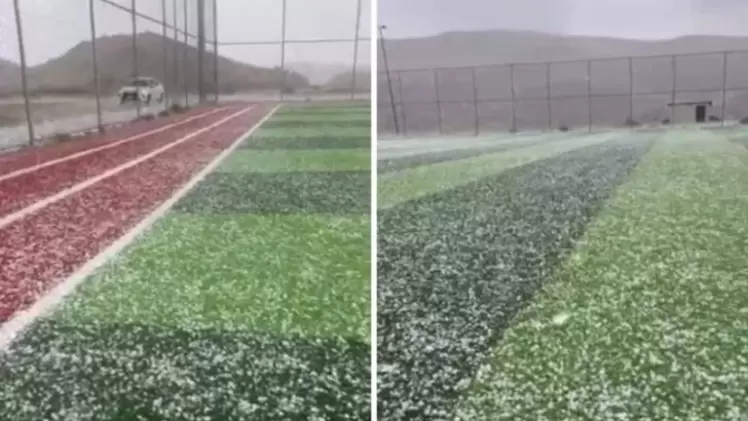 وأظهر مصور الفيديو تساقط حبات البَرَد على ملعب كرة قدم في هذه المنطقة من مرتفعات عسير، ما تسبب في تغطية الأرض باللون الأبيض.