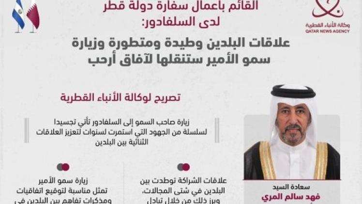 أكد سعادة السيد فهد سالم المري القائم بأعمال سفارة دولة قطر لدى السلفادور ، أن العلاقات القائمة بين دولة قطر وجمهورية السلفادور وطيدة ومتطورة، لافتا إلى أن زيارة حضرة صاحب السمو الشيخ تميم بن حمد آل ثاني أمير البلاد المفدى (حفظه الله) إلى جمهورية السلفادور، تأتي تجسيدا لسلسلة من الجهود التي استمرت لسنوات؛ من أجل تعزيز العلاقات الثنائية القائمة بين البلدين الصديقين، وستساهم في نقلها نحو آفاق أرحب.