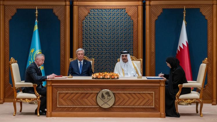 شهد حضرة صاحب السمو الشيخ تميم بن حمد آل ثاني أمير البلاد المفدى، وفخامة الرئيس قاسم جومارت توكاييف رئيس جمهورية كازاخستان الصديقة، اليوم، مراسم التوقيع على عدد من الاتفاقيات ومذكرات التفاهم بين حكومتي البلدين.