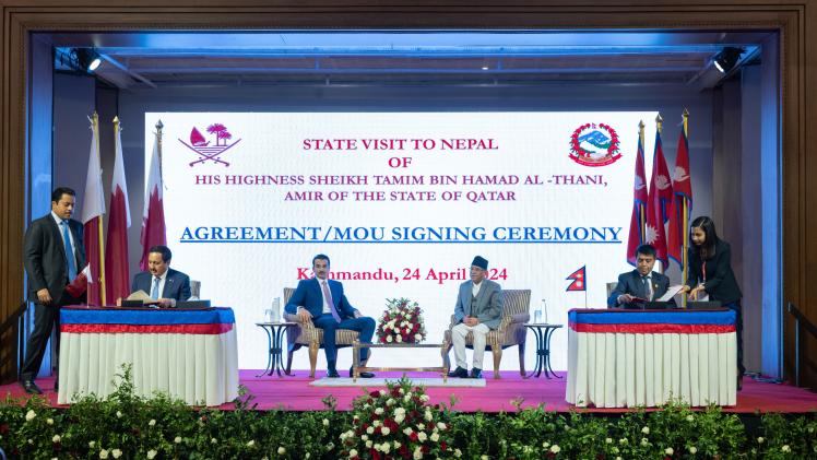 شهد حضرة صاحب السمو الشيخ تميم بن حمد آل ثاني أمير البلاد المفدى، ودولة السيد بوشبا كمال دهال رئيس وزراء نيبال الصديقة، اليوم، مراسم التوقيع على عدد من الاتفاقيات ومذكرات التفاهم والتعاون بين حكومتي البلدين، حيث شهدا التوقيع على مذكرة تفاهم للتعاون في مجال التعليم والتعليم العالي والبحث العلمي، ومذكرة تفاهم للتعاون بين النيابة العامة بدولة قطر ومكتب النائب العام في نيبال، ومذكرة تفاهم للتعاون في مجال الشباب والرياضة.