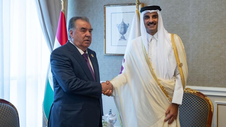 استقبل حضرة صاحب السمو الشيخ تميم بن حمد آل ثاني أمير البلاد المفدى، فخامة الرئيس إمام علي رحمان رئيس جمهورية طاجيكستان الصديقة، وذلك على هامش انعقاد القمة الثالثة لحوار التعاون الآسيوي صباح اليوم بفندق ريتز كارلتون – الدوحة.