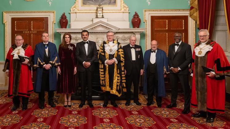 حضر صاحب السمو الشيخ تميم بن حمد آل ثاني أمير البلاد المفدى، مأدبة العشاء التي أقامها سعادة اللورد أليستر كينغ عمدة الحي المالي لمدينة لندن بالمملكة المتحدة تكريما لسموه، وذلك في مبنى مانشن هاوس بمدينة لندن اليوم.