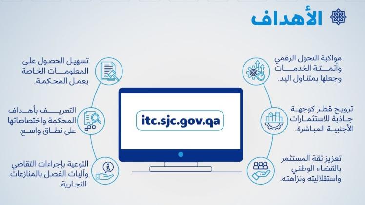 يتضمن الموقع https://itc.sjc.gov.qa تعريفا شاملا بالمحكمة، التي تعد الأولى من نوعها في مجال القضاء المتخصص، والهادفة إلى توفير بيئة استثمارية جاذبة ومستقرة، في ظل الحرص الذي توليه دولة قطر لتطوير إجراءاتها القضائية، وتحديث منظومتها التشريعية وفي مقدمتها الاستثمارية، لضمان حقوق المتقاضين، وتسريع الفصل بالمنازعات وتسويتها بكفاءة وجودة عالية.