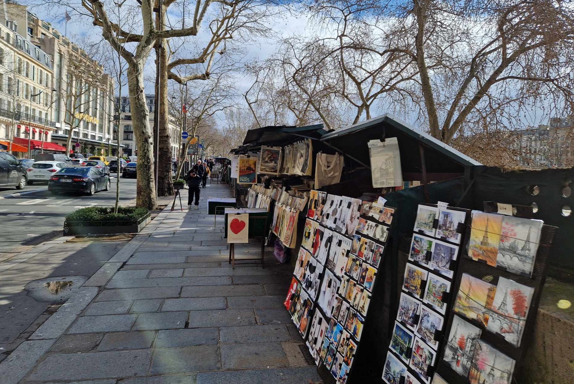 وتتناثر على ضفاف النهر، ولمسافة 3 كيلومترات، أكشاك خضراء اللون لا تتجاوز مساحة الواحد منها بضعة أمتار، تعرض فيها الكتب التي يعود تاريخ بعضها إلى بداية القرن السادس عشر، في مشهد مألوف صار يجلب السياح من كافة أنحاء العالم، مثله مثل برج إيفل أو أي معلم ثقافي آخر. ويقدر بعض الباحثين أن عرض الكتب على ضفاف النهر يعود لأكثر من 450 عاما.