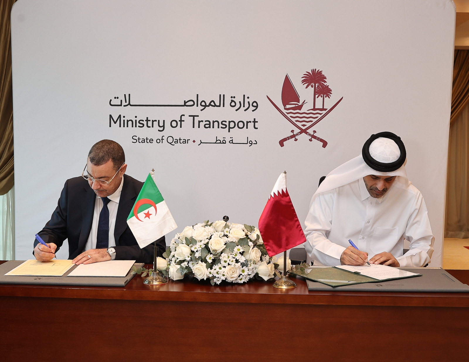 وقع سعادة الشيخ محمد بن عبدالله بن محمد آل ثاني وزير المواصلات، وسعادة السيد السعيد سعيود وزير النقل الجزائري اتفاقية خدمات النقل الجوي بين دولة قطر والجمهورية الجزائرية الديمقراطية الشعبية.