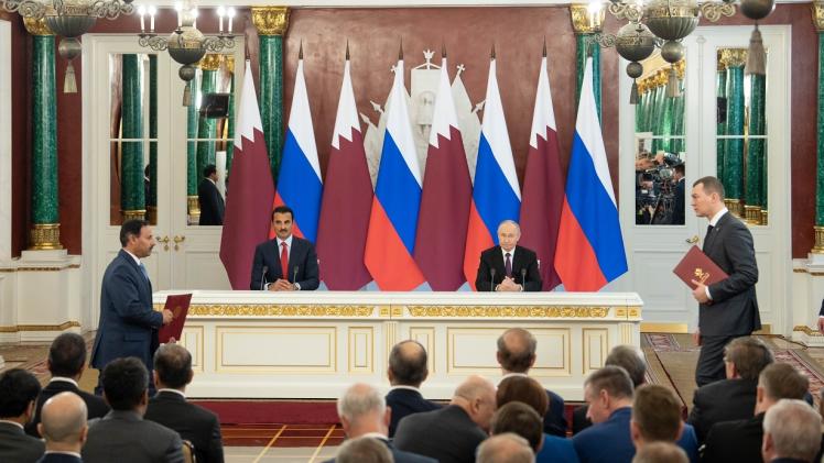 شهد حضرة صاحب السمو الشيخ تميم بن حمد آل ثاني أمير البلاد المفدى، وفخامة الرئيس فلاديمير بوتين رئيس روسيا الاتحادية الصديقة، تبادل اتفاقية ومذكرات تفاهم بين البلدين، في قصر الكرملين بالعاصمة موسكو اليوم.