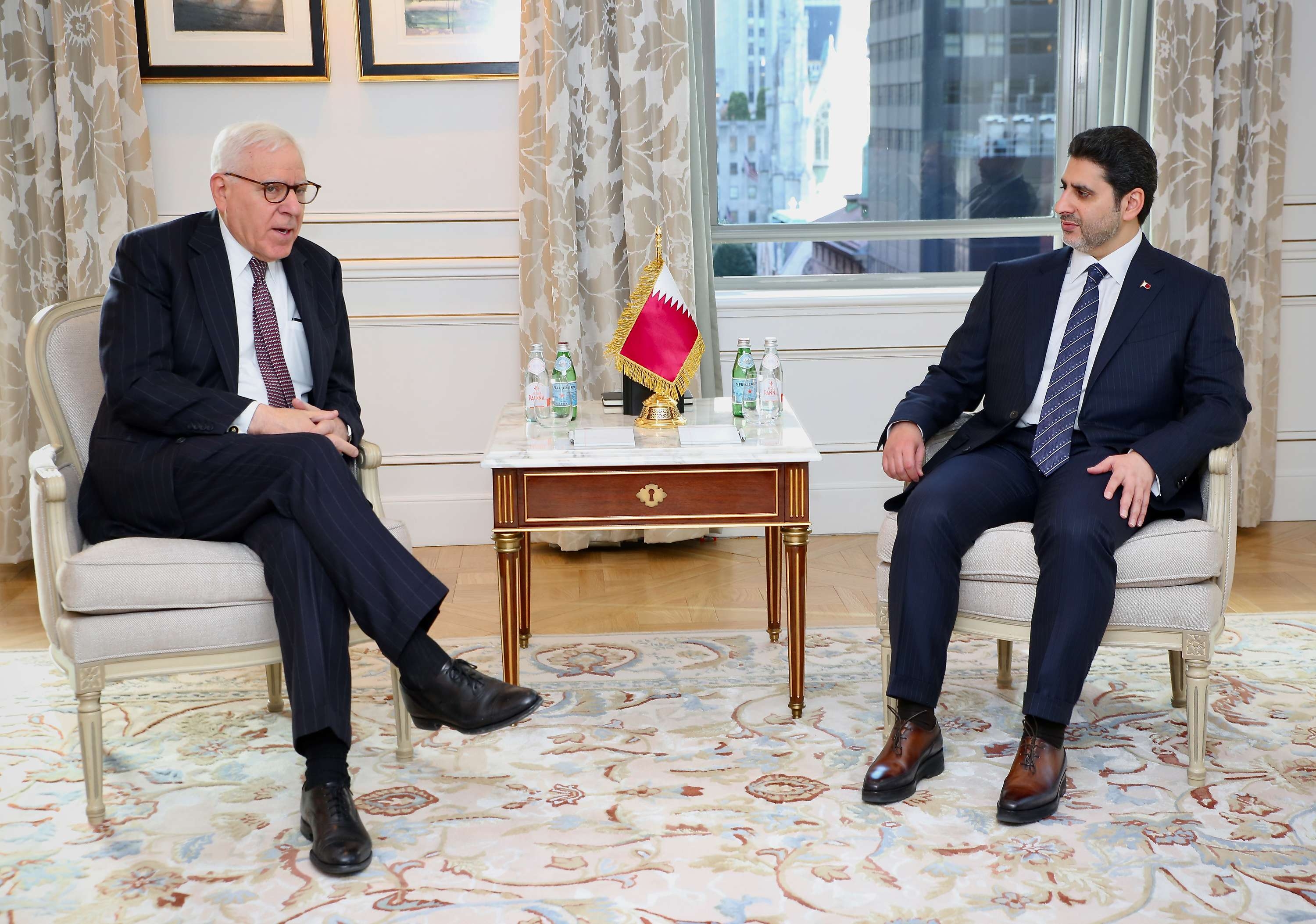 اجتمع سعادة الشيخ بندر بن محمد بن سعود آل ثاني محافظ مصرف قطر المركزي رئيس مجلس إدارة جهاز قطر للاستثمار مع السيد ديفيد روبنشتاين الشريك المؤسس والرئيس المشارك لمجلس إدارة مجموعة كارلايل، والوفد المرافق له، في نيويورك وذلك خلال زيارته الحالية إلى الولايات المتحدة الأمريكية.