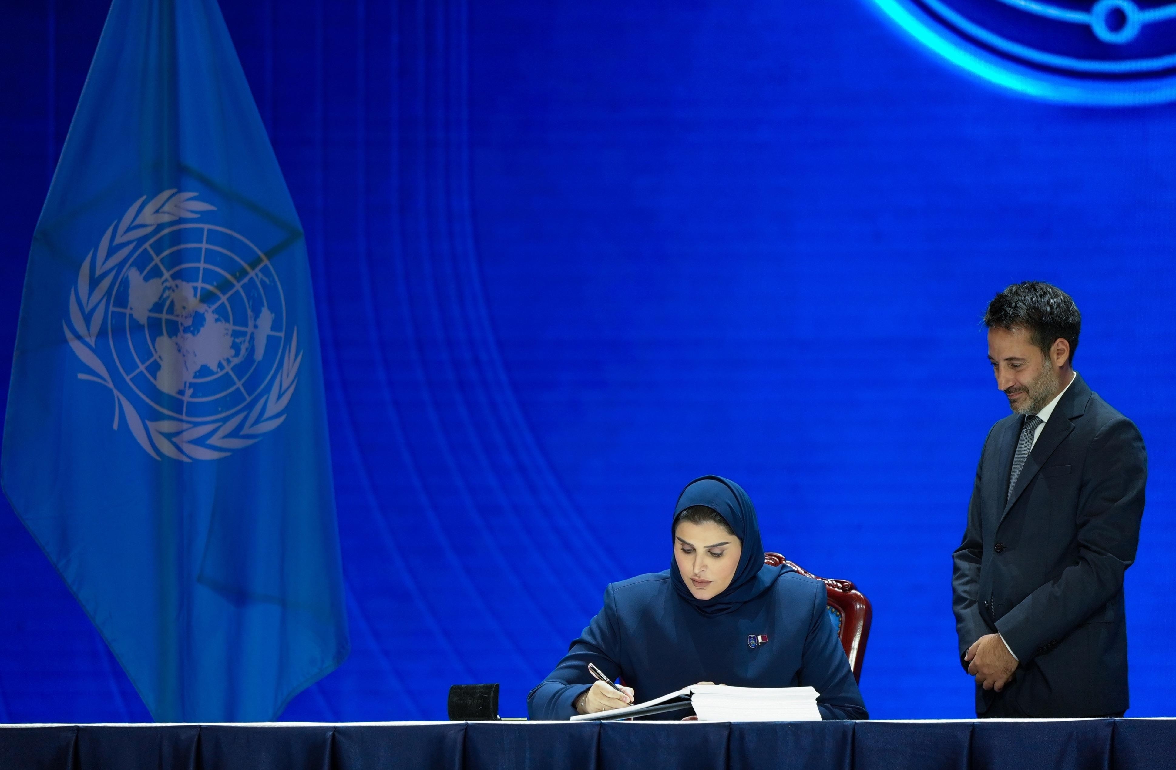 وقع الاتفاقية نيابة عن دولة قطر، سعادة الدكتورة مريم بنت علي بن ناصر المسند وزير الدولة للتعاون الدولي.