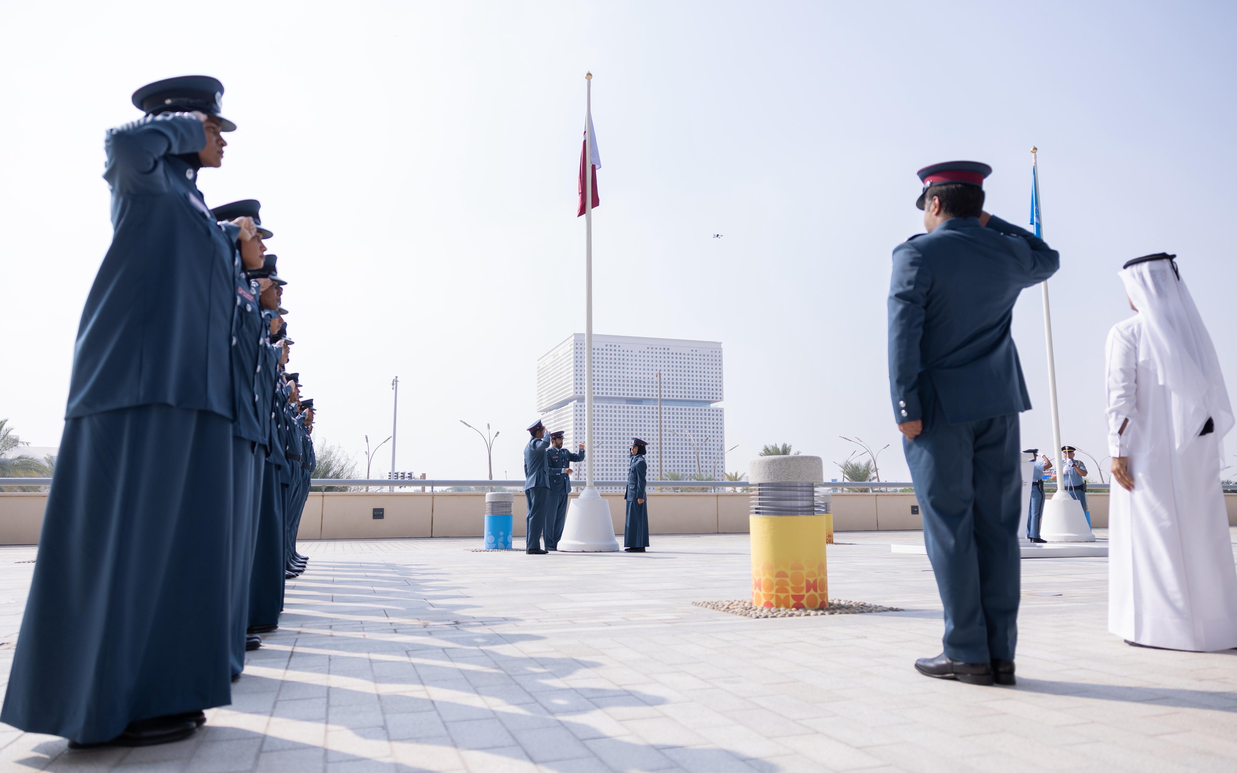 واختتمت المراسم برفع علم دولة قطر والأمم المتحدة من قبل قوة الأمن الداخلي (لخويا) وأمن الأمم المتحدة، مصحوبا بموسيقى احتفالية عزفتها فرقة (لخويا)، في مشهد رمزي يجسد عمق الشراكة الوثيقة بين دولة قطر والأمم المتحدة، والتزام الجانبين بمواصلة الجهود المشتركة لتحقيق التنمية الاجتماعية الشاملة والمستدامة.