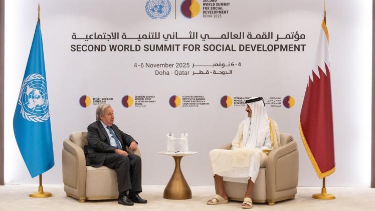 التقى حضرة صاحب السمو الشيخ تميم بن حمد آل ثاني أمير البلاد المفدى، اليوم، سعادة السيد أنطونيو غوتيريش الأمين العام للأمم المتحدة، وذلك على هامش مؤتمر القمة العالمي الثاني للتنمية الاجتماعية المنعقد في مركز قطر الوطني للمؤتمرات.