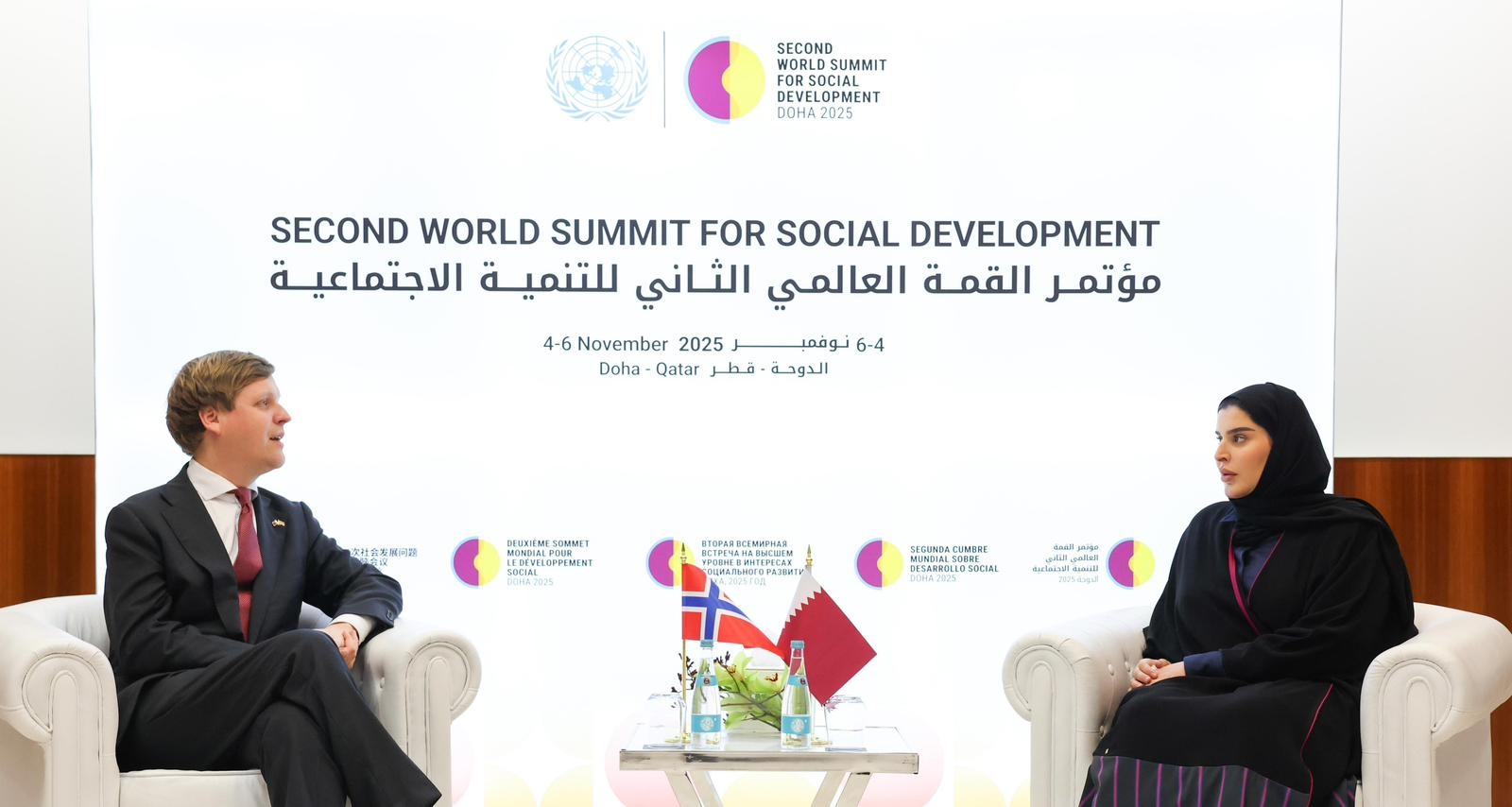 اجتمعت سعادة الدكتورة مريم بنت علي بن ناصر المسند وزير الدولة للتعاون الدولي، اليوم الأربعاء، مع سعادة السيد أوسموند كروست وزير التنمية الدولية بمملكة النرويج، على هامش مؤتمر القمة العالمي الثاني للتنمية الاجتماعية، المنعقد حاليا بالدوحة.