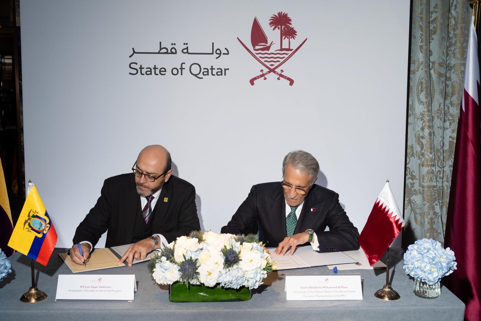 وفي ذات السياق، وقعت وزارة المواصلات ووزارة البنية التحتية والنقل في جمهورية الإكوادور، على هامش أعمال ذات الدورة في لندن، مذكرة تفاهم للتعاون في مجال الموانئ وقعها عن الجانب القطري سعادة الشيخ عبدالله بن محمد بن سعود آل ثاني سفير دولة قطر لدى المملكة المتحدة وإيرلندا والمندوب الدائم للدولة لدى المنظمة البحرية الدولية (IMO)، وعن الجانب الإكوادوري سعادة السيد لويس فاياس فالديفيسو سفير جمهورية الإكوادور لدى المملكة المتحدة.