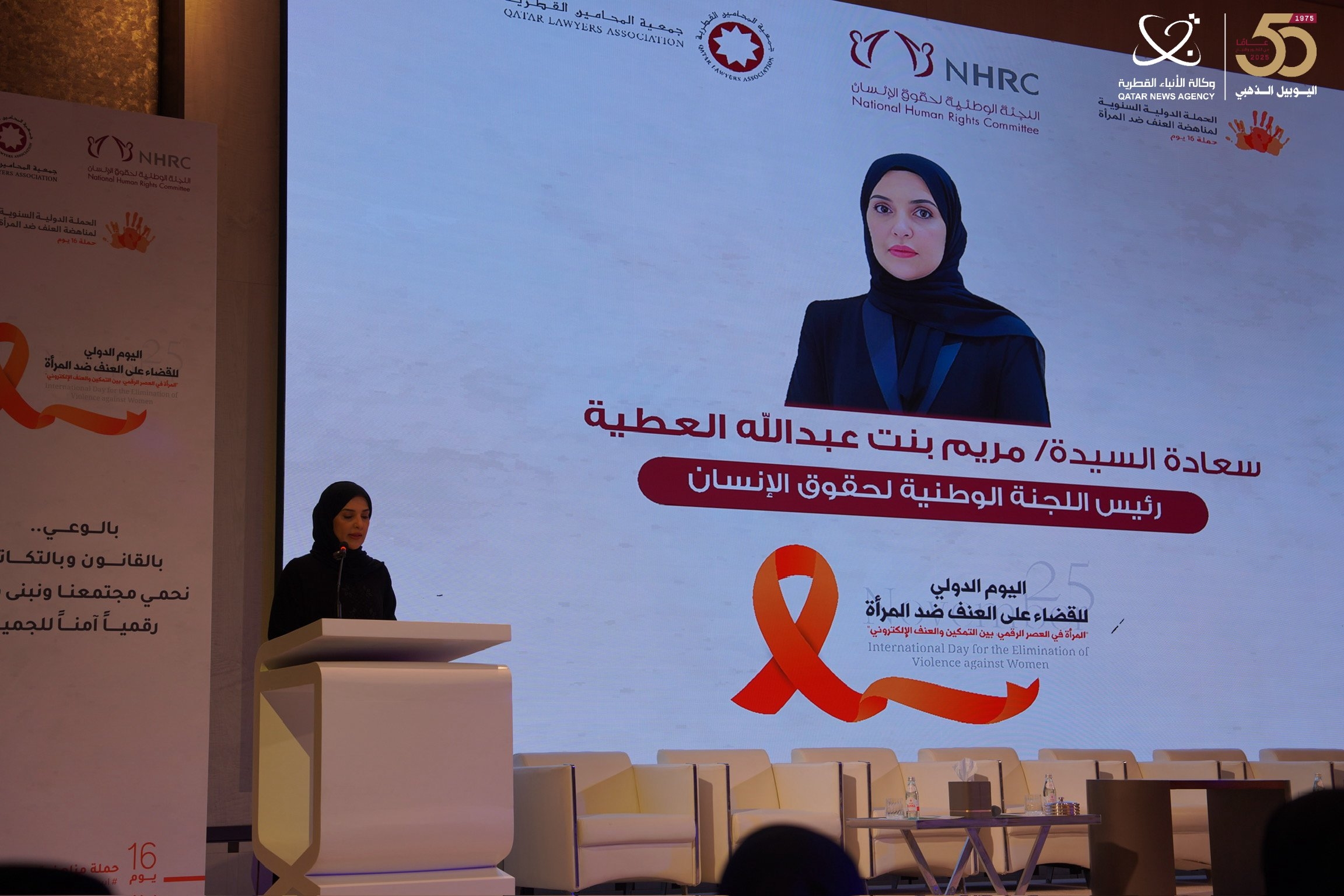 نظمت اللجنة الوطنية لحقوق الإنسان، بالتعاون مع جمعية المحامين القطريين، اليوم، حلقة نقاشية بعنوان:" المرأة في العصر الرقمي بين التمكين والعنف الإلكتروني"، وذلك في إطار اليوم الدولي للقضاء على العنف ضد المرأة، وضمن حملة "16 يوما لمناهضة العنف ضد المرأة" التي أطلقتها وزارة التنمية الاجتماعية والأسرة.