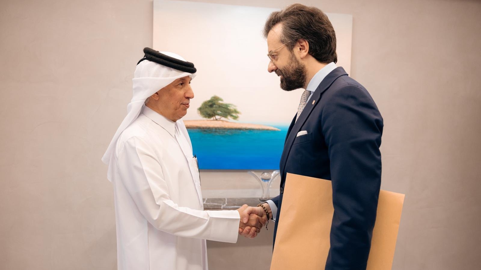 تسلم الرسالة سعادة السيد سلطان بن سعد المريخي وزير الدولة للشؤون الخارجية، خلال اجتماعه مع سعادة السيد ألبارو رينيدو زالبا سفير مملكة إسبانيا لدى الدولة.