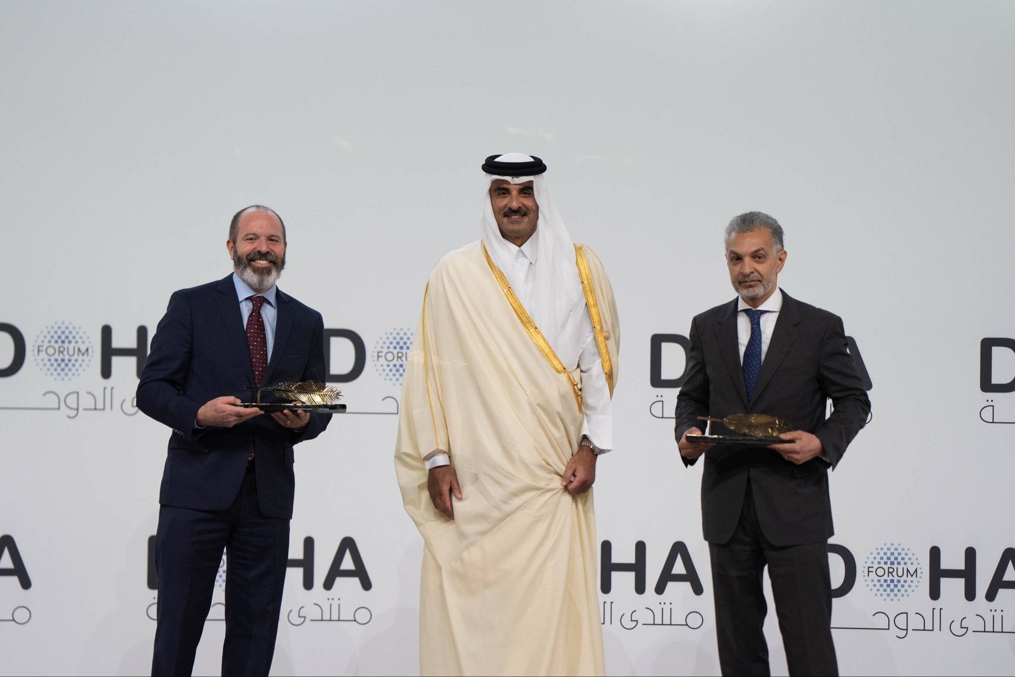 وخلال الافتتاح قام سمو الأمير المفدى بتسليم جائزة منتدى الدوحة إلى كل من السيد أليكس ثير والسيد سعد محسني، تقديرا لمساهمتهما في دعم تعليم الأطفال في دولة فلسطين وأفغانستان، بالشراكة مع مؤسسة التعليم فوق الجميع.