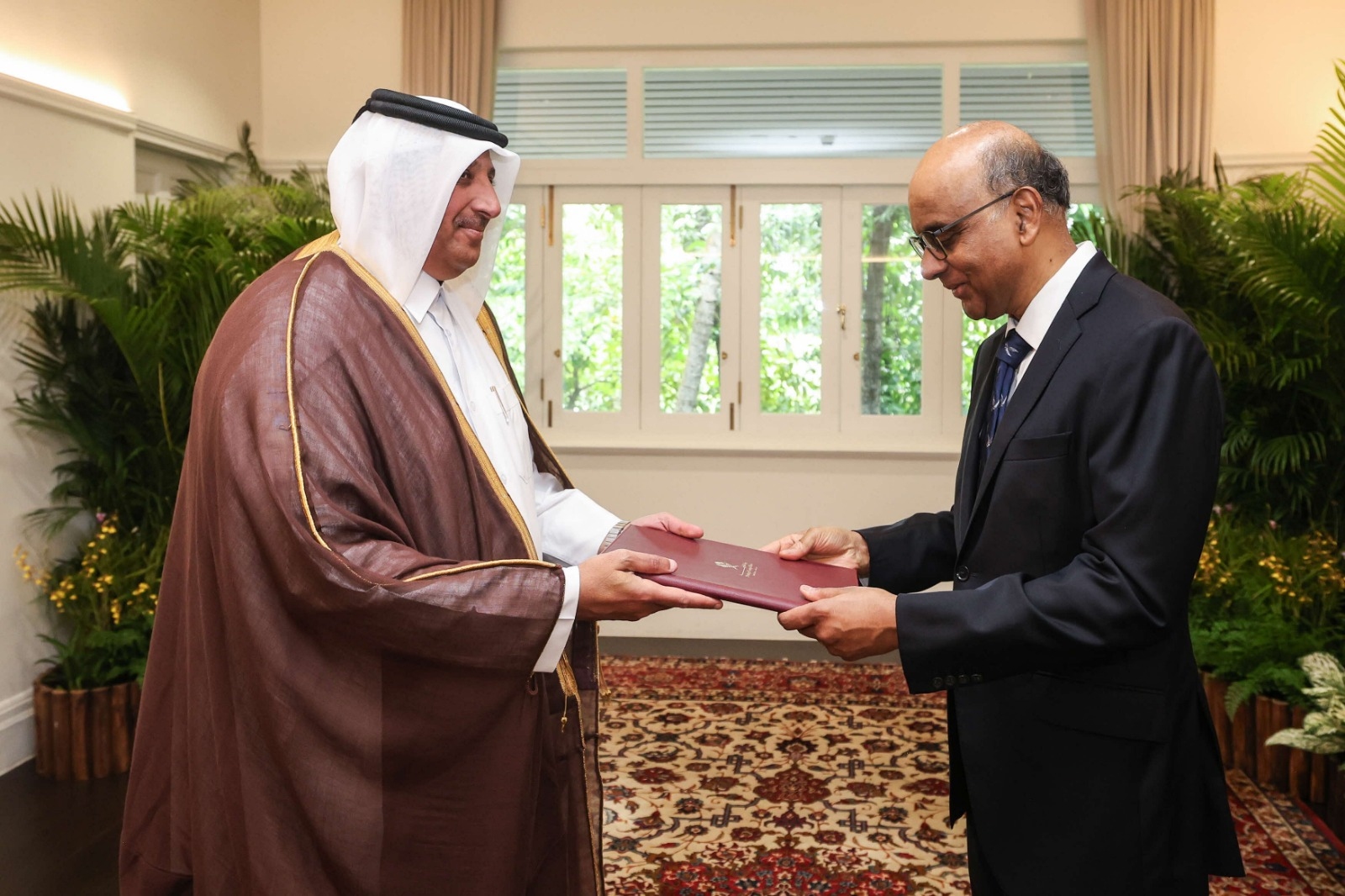 تسلم فخامة الرئيس ثارمان شانموغاراتنام، رئيس جمهورية سنغافورة، أوراق اعتماد سعادة السيد عبد العزيز بن أحمد المالكي الجهني، سفيرا فوق العادة مفوضا لدولة قطر لدى جمهورية سنغافورة.