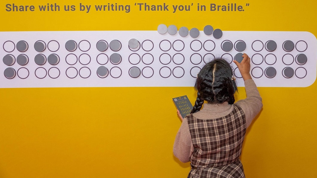 وتتمثل الفعالية، في جدارية تفاعلية تمكن الزوار من كتابة كلمة "شكرا" وأسمائهم بطريقة برايل عبر لوحة مخصصة، تترافق مع عبارة تضامنية تعبر عن الدعم والتقدير للأشخاص ذوي الإعاقة البصرية، ما يتيح تجربة مباشرة تعرف الجمهور بأساسيات القراءة والكتابة بطريقة برايل.