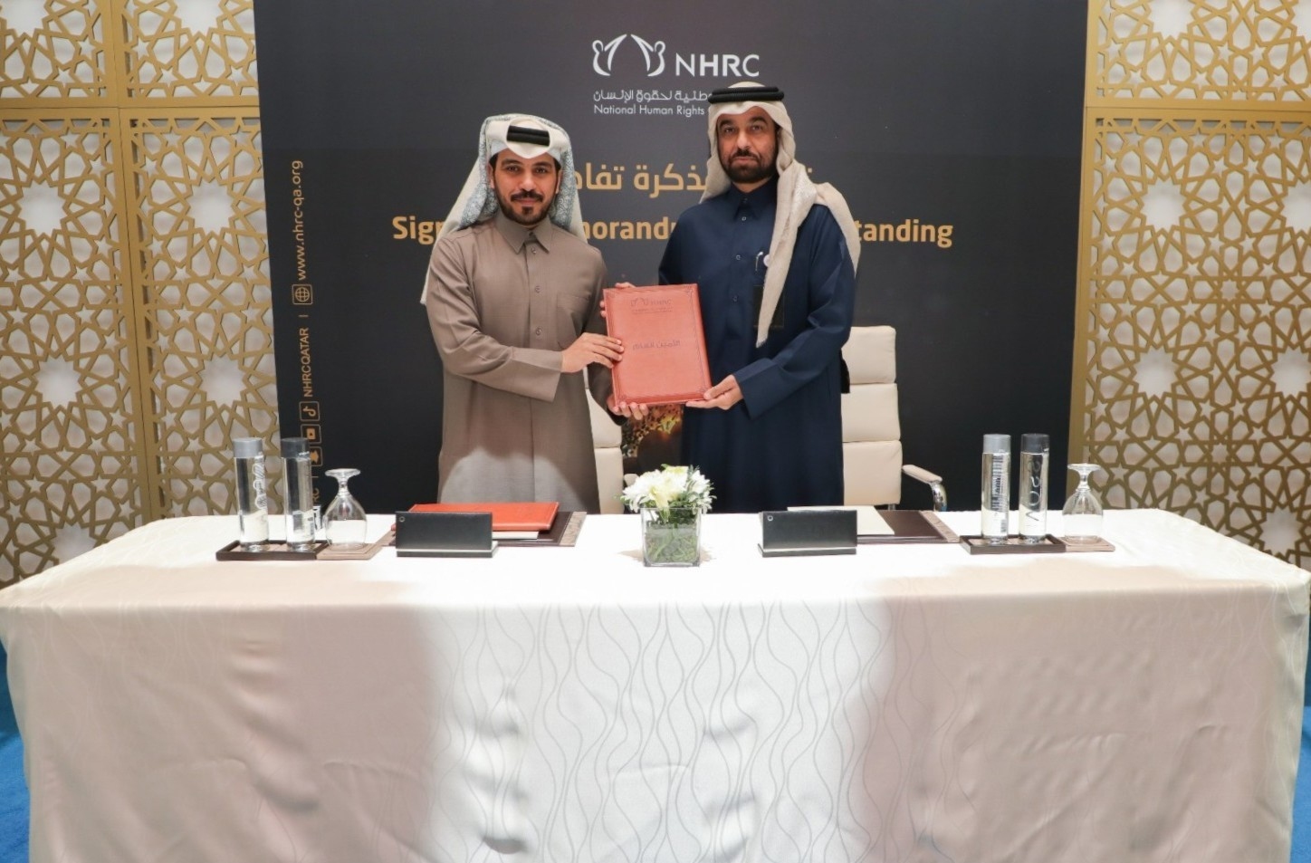 وقع مذكرة التفاهم سعادة السيد سلطان بن حسن الجمّالي، الأمين العام للجنة الوطنية لحقوق الإنسان، والسيد عبدالله الدوسري المدير التنفيذي للاتحاد القطري للرياضة للجميع، وذلك على هامش أعمال المنتدى الوطني الرابع لحقوق الإنسان، الذي اختتم أعماله اليوم بالدوحة.