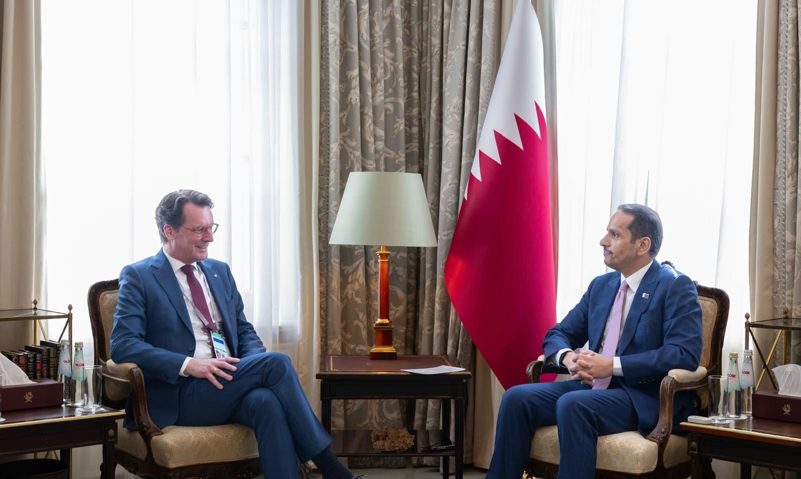 اجتمع معالي الشيخ محمد بن عبدالرحمن بن جاسم آل ثاني رئيس مجلس الوزراء وزير الخارجية، اليوم، مع سعادة السيد هندريك فوست رئيس وزراء ولاية شمال الراين- ويستفاليا بجمهورية ألمانيا الاتحادية، وذلك على هامش مؤتمر ميونخ للأمن.