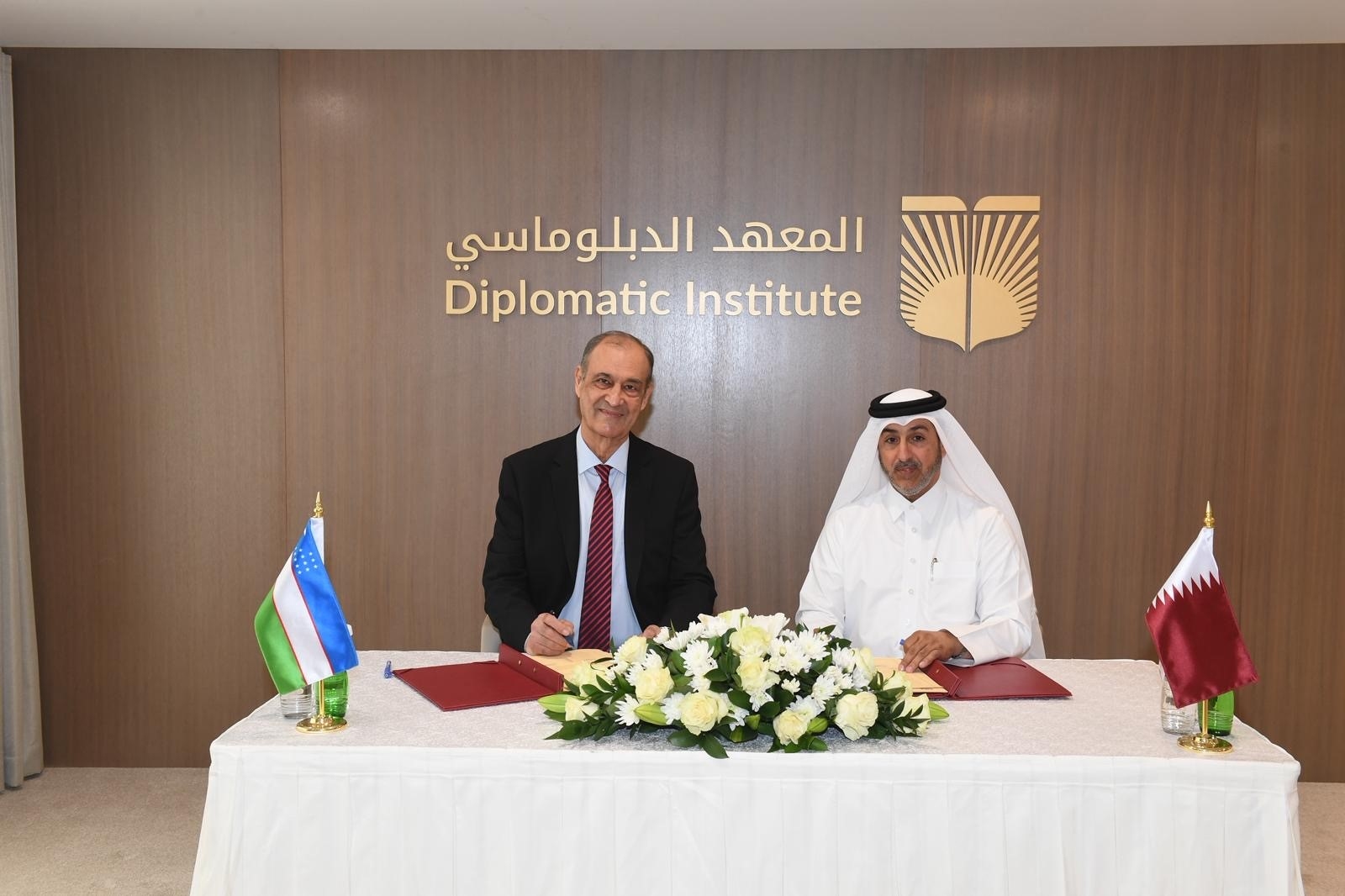 وقع مذكرة التفاهم سعادة الدكتور عبد العزيز محمد الحر، مدير المعهد الدبلوماسي بوزارة الخارجية، وسعادة السيد عبدالصمد خيدروف مدير الأكاديمية الدبلوماسية في جامعة الاقتصاد العالمي والدبلوماسية التابعة لوزارة الشؤون الخارجية في جمهورية أوزبكستان، على هامش جولة المشاورات السياسية بين وزارتي الخارجية في البلدين التي عقدت بالدوحة.