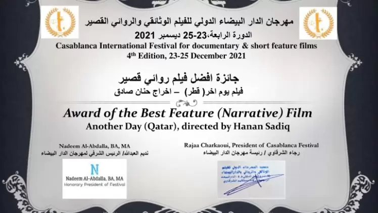 توج الفيلم القطري "يوم آخر" بجائزة أفضل فيلم روائي في الدورة الرابعة لمهرجان الدار البيضاء الدولي للأفلام الروائية والوثائقية القصيرة.