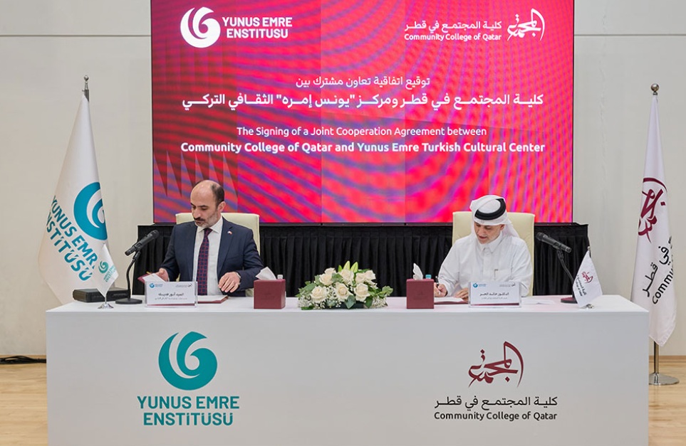 وقعت كلية المجتمع في قطر، اتفاقية تعاون مشترك مع مركز "يونس إمره" الثقافي التركي في الدوحة، بهدف إدراج تعليم اللغة التركية ضمن برامجها الأكاديمية، وتعزيز التبادل الثقافي والعلمي بين الجانبين، بما يسهم في إثراء تجربة الطلبة الأكاديمية والإنسانية.