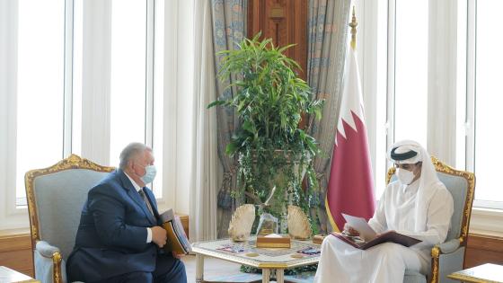 تسلم حضرة صاحب السمو الشيخ تميم بن حمد آل ثاني أمير البلاد المفدى ، رسالة خطية ، من فخامة الرئيس فلاديمير بوتين رئيس روسيا الاتحادية، تتصل بالعلاقات الثنائية الوطيدة بين البلدين الصديقين وسبل دعمها وت