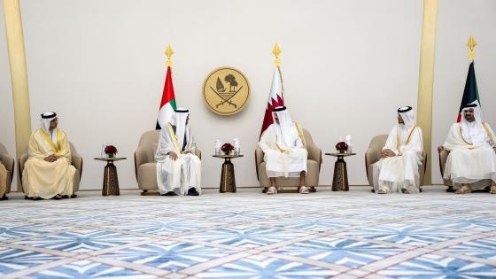 تقدم حضرة صاحب السمو الشيخ تميم بن حمد آل ثاني أمير البلاد المفدى، مستقبلي أخيه صاحب السمو الشيخ محمد بن زايد آل نهيان رئيس دولة الإمارات العربية المتحدة الشقيقة، لدى وصوله الصالة الأميرية بمطار حمد الدولي.
