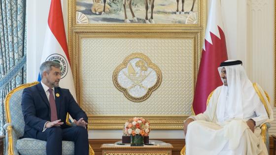 استقبل حضرة صاحب السمو الشيخ تميم بن حمد آل ثاني أمير البلاد المفدى، بالديوان الأميري صباح اليوم، فخامة الرئيس ماريو عبده بينيتز رئيس جمهورية باراغواي، والوفد المرافق له بمناسبة زيارته البلاد، للمشاركة في منتدى قطر الاقتصادي 2023.
