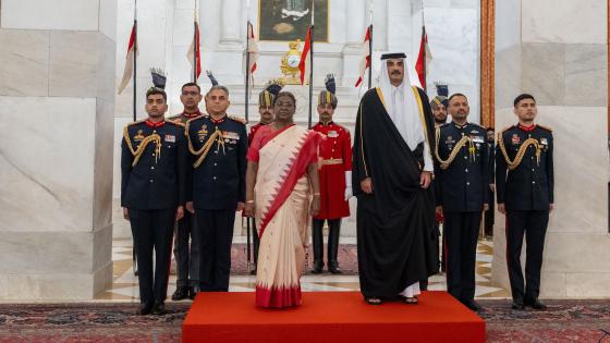حضر صاحب السمو الشيخ تميم بن حمد آل ثاني أمير البلاد المفدى، مأدبة عشاء رسمية أقامتها فخامة الرئيسة دروبادي مورمو رئيسة جمهورية الهند الصديقة، تكريمًا لسموه والوفد المرافق في قصر راشتراباتي بهوان.