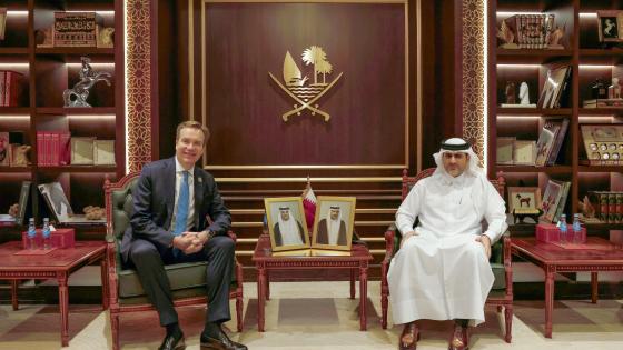 اجتمع سعادة الشيخ بندر بن محمد بن سعود آل ثاني محافظ مصرف قطر المركزي، اليوم، مع سعادة السيد بورجي براندي، رئيس المنتدى الاقتصادي العالمي، والسيد تريفور تومسون، الرئيس العالمي للتنمية في شركة سكيل للذكاء الاصطناعي.