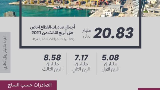 أظهر تقرير لغرفة قطر أن قيمة صادرات القطاع الخاص بلغت، حتى نهاية الربع الثالث من العام الجاري، نحو 20.9 مليار ريال، مقابل 11.1 مليار ريال للفترة ذاتها من العام الماضي، محققة ارتفاعا قياسيا بنسبة تزيد